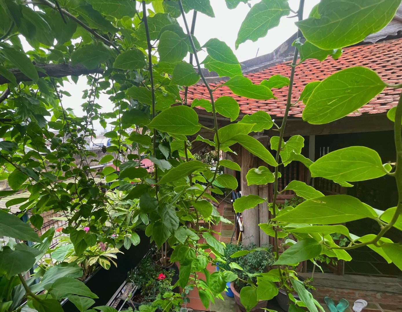 Nhiều người không thể ngờ rằng, không gian nhà gỗ 3 gian mộc mạc, nhuốm màu thời gian cùng góc vườn sum sê này lại tọa lạc ngay tầng 5 của một căn nhà phố ở Hà Nội. Anh Huy gọi không gian này là "Nhà quê trong phố".