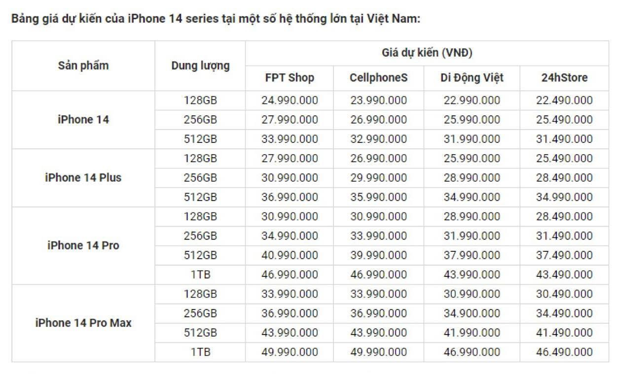 Ngay sau khi sự kiện ra mắt iPhone 14 kết thúc, nhiều nhà bán lẻ lớn tại Việt Nam cũng đã ngay lập tức công bố giá bán dự kiện của iPhone 14 chính hãng.