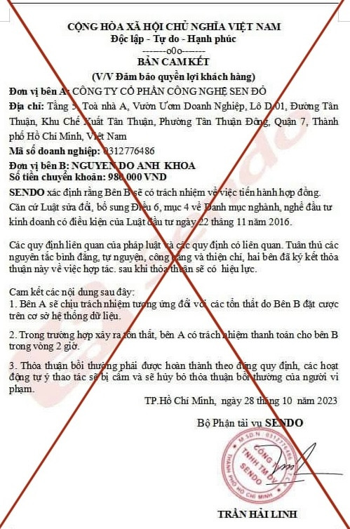 Để tạo lòng tin cho người tham gia, chủ nhóm còn đưa ra các bản cam kết giả mạo Công ty Sen Đỏ. Cụ thể, bản cam kết này bên A là Công ty cổ phần Công nghệ Sen Đỏ, có địa chỉ của chính công ty này ở quận 7, TP.HCM, đi kèm là mã số doanh nghiệp. Bên B là tên những người tham gia nhận nhiệm vụ chất lượng cao và đi kèm là số tiền đã nộp cho các đối tượng lừa đảo. Đồng thời, bản cam kết có các nội dung như: Bên A sẽ chịu trách nhiệm tương ứng đối với các tổn thất do bên B đạt được trên cơ sở hệ thống dữ liệu; Trong trường hợp xảy ra tổn thất, bên A có trách nhiệm thanh toán cho bên B trong vòng 2 giờ; Thoả thuận bồi thường phải được hoàn thành theo đúng quy định, các hoạt động tự ý thao tác sẽ bị cấm và sẽ huỷ bỏ thoả thuận bồi thường cho người vi phạm. Cuối bản cam kết ghi bộ phận tài vụ SENDO, kèm dấu đỏ, ký tên Trần Hải Linh.