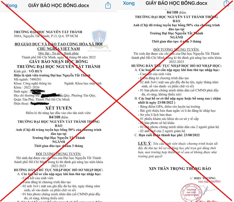 Theo nhà trường, hiện tại có một số đối tượng giả danh Trường ĐH Nguyễn Tất Thành gửi thông báo trúng tuyển và kèm theo suất học bổng được nhận cho học sinh nhằm mục đích khai thác thông tin cá nhân để thực hiện các hành vi trục lợi.