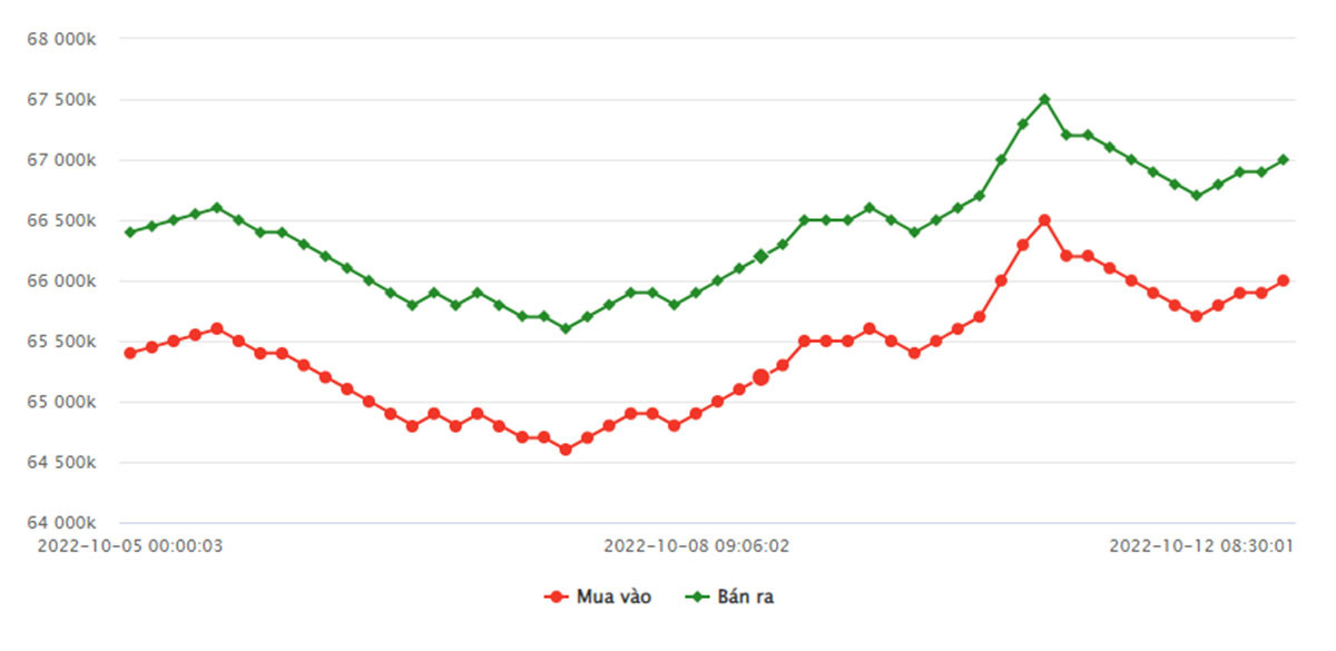 Đến đầu giờ chiều nay (12/10), giá vàng miếng của SJC không đổi so với buổi sáng. Còn giá vàng miếng của Doji tại Hà Nội và TP.HCM tăng 200 nghìn đồng/lượng ở chiều mua vào và tăng 100 nghìn đồng/lượng ở chiều bán ra so với đầu giờ sáng, giao dịch ở mức 66 - 66,9 triệu đồng/lượng.