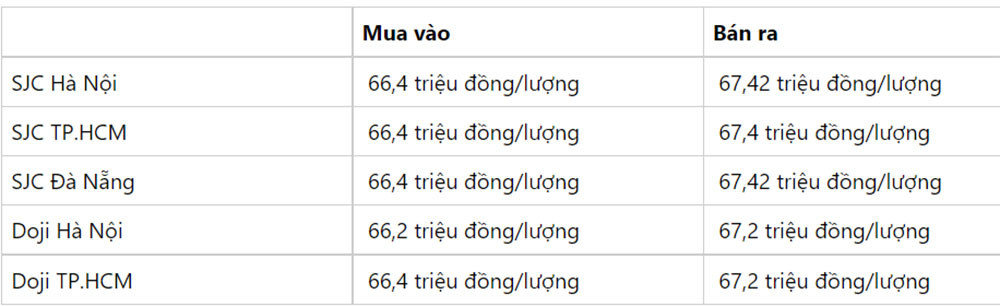 | SJC Đà Nẵng | 66,8 triệu đồng/lượng | 67,82 triệu đồng/lượng |