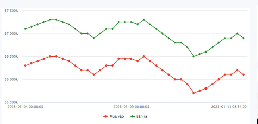 | Doji Hà Nội | 66,1 triệu đồng/lượng | 67 triệu đồng/lượng |