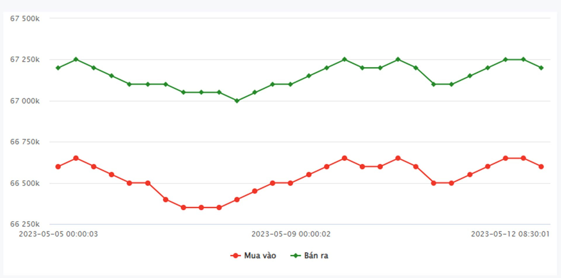 Chốt phiên giao dịch 11/5, giá vàng miếng 9999 tại SJC TP.HCM là 66,65 triệu đồng/lượng (mua vào) và 67,25 triệu đồng/lượng (bán ra). SJC Hà Nội niêm yết ở mức 66,65 triệu đồng/lượng (mua vào) và 67,27 triệu đồng/lượng (bán ra).