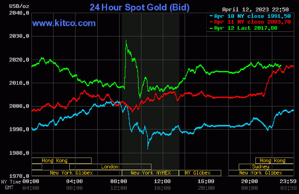 Đêm 12/4 (giờ Việt Nam), giá vàng thế giới giao ngay đứng quanh ngưỡng 2.021 USD/ounce. Vàng giao tháng 6 trên sàn Comex New York ở mức 2.025 USD/ounce.