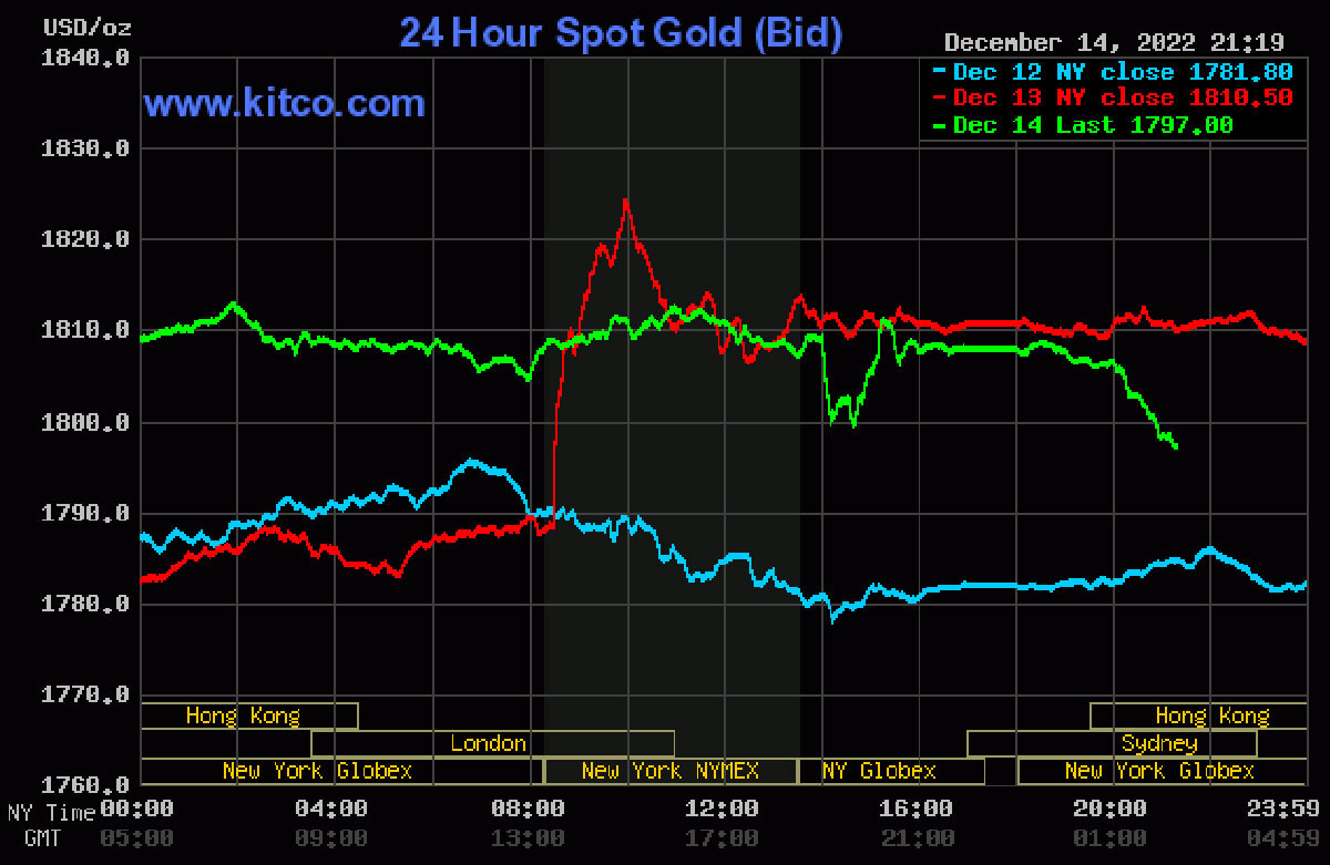 Tới 9h15' hôm nay (ngày 15/12, giờ Việt Nam), giá vàng thế giới giao ngay đứng quanh ngưỡng 1.796,7 USD/ounce, giảm 12,3 USD/ounce so với đêm qua. Giá vàng giao tương lai tháng 2/2023 trên sàn Comex New York ở mức 1.808,4 USD/ounce, giảm 6,6 USD/ounce so với đêm qua.