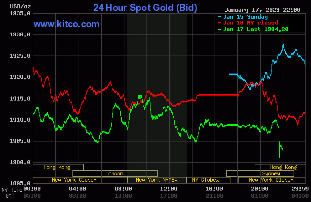 Đêm 17/1 (giờ Việt Nam), giá vàng thế giới giao ngay đứng quanh ngưỡng 1.908 USD/ounce. Vàng giao tháng 2 trên sàn Comex New York ở mức 1.913 USD/ounce.