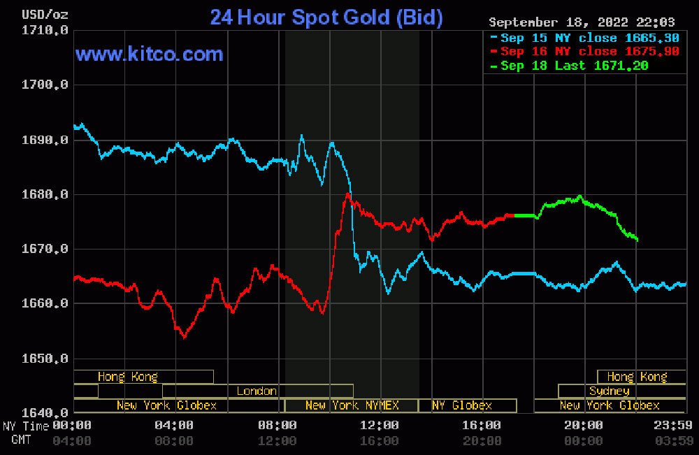Trên thị trường vàng thế giới, giá vàng giao ngay chốt phiên tại Mỹ ở mức 1.675,9 USD/ounce. Giá vàng tương lai giao tháng 12/2022 trên sàn Comex New York giảm ở mức 1.676,5 USD/ounce.