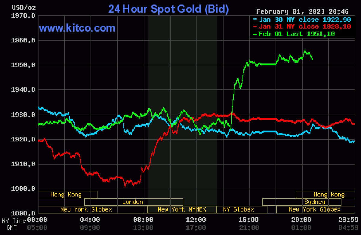 Đêm 1/2 (giờ Việt Nam), giá vàng thế giới giao ngay đứng quanh ngưỡng 1.931 USD/ounce. Vàng giao tháng 4 trên sàn Comex New York ở mức 1.945 USD/ounce.