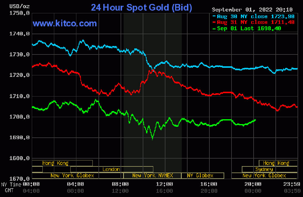Đêm 1/9 (giờ Việt Nam), giá vàng thế giới giao ngay đứng quanh ngưỡng 1.698 USD/ounce. Vàng giao tháng 12 trên sàn Comex New York ở mức 1.707 USD/ounce.