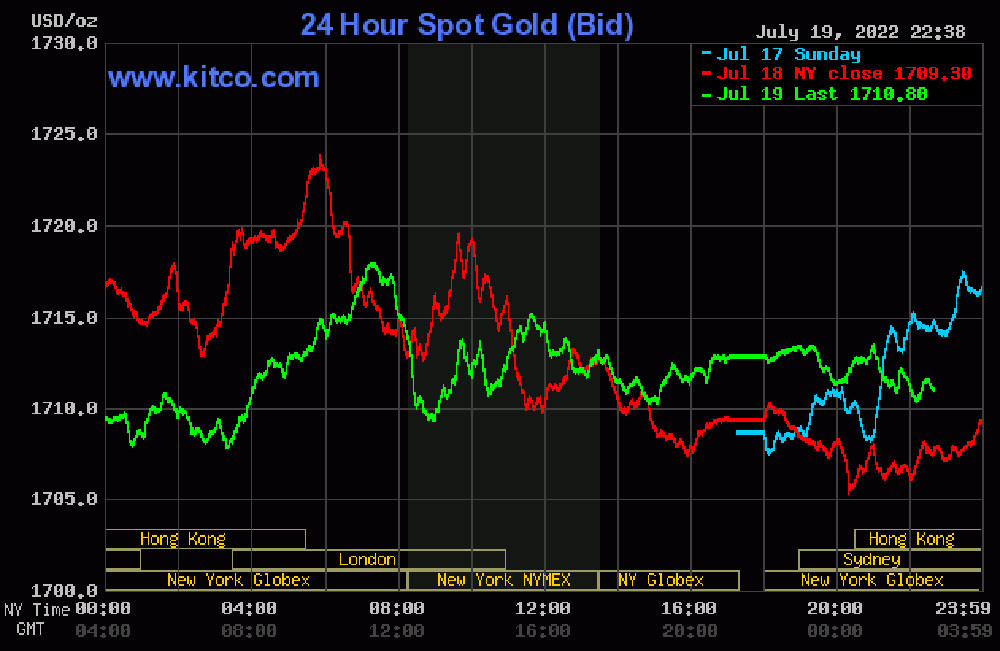 Đêm 19/7 (giờ Việt Nam), giá vàng thế giới giao ngay đứng quanh ngưỡng 1.711 USD/ounce. Vàng giao tháng 8 trên sàn Comex New York ở mức 1.712 USD/ounce.