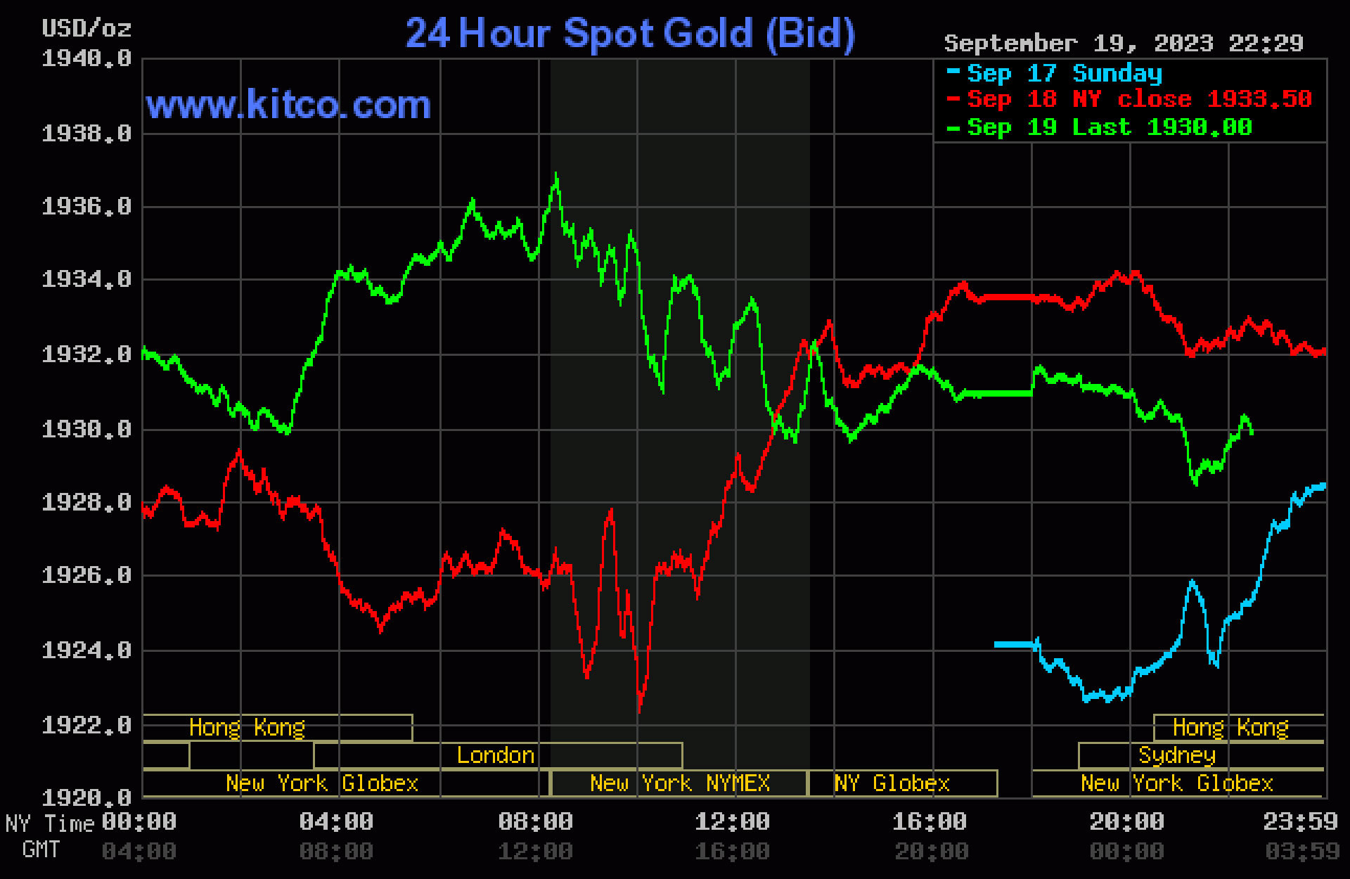 Đêm 19/9 (giờ Việt Nam), giá vàng thế giới giao ngay đứng quanh ngưỡng 1.936 USD/ounce. Vàng giao tháng 12 trên sàn Comex New York ở mức 1.966 USD/ounce.