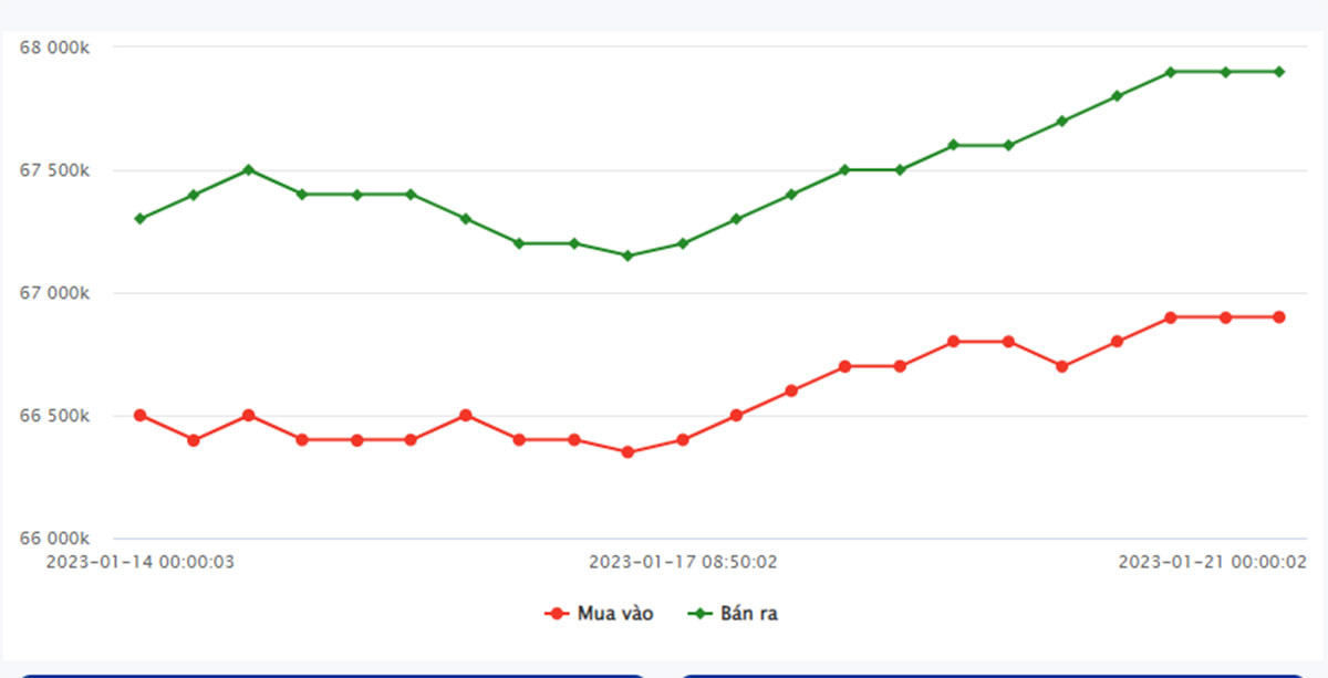 Kết thúc phiên giao dịch trước kỳ nghỉ Tết Nguyên đán 19/1, giá vàng miếng 9999 tại SJC TP.HCM là 66,9 triệu đồng/lượng (mua vào) - 67,9 triệu đồng/lượng (bán ra). SJC Hà Nội niêm yết ở mức 66,9 triệu đồng/lượng (mua vào) và 67,92 triệu đồng/lượng (bán ra).