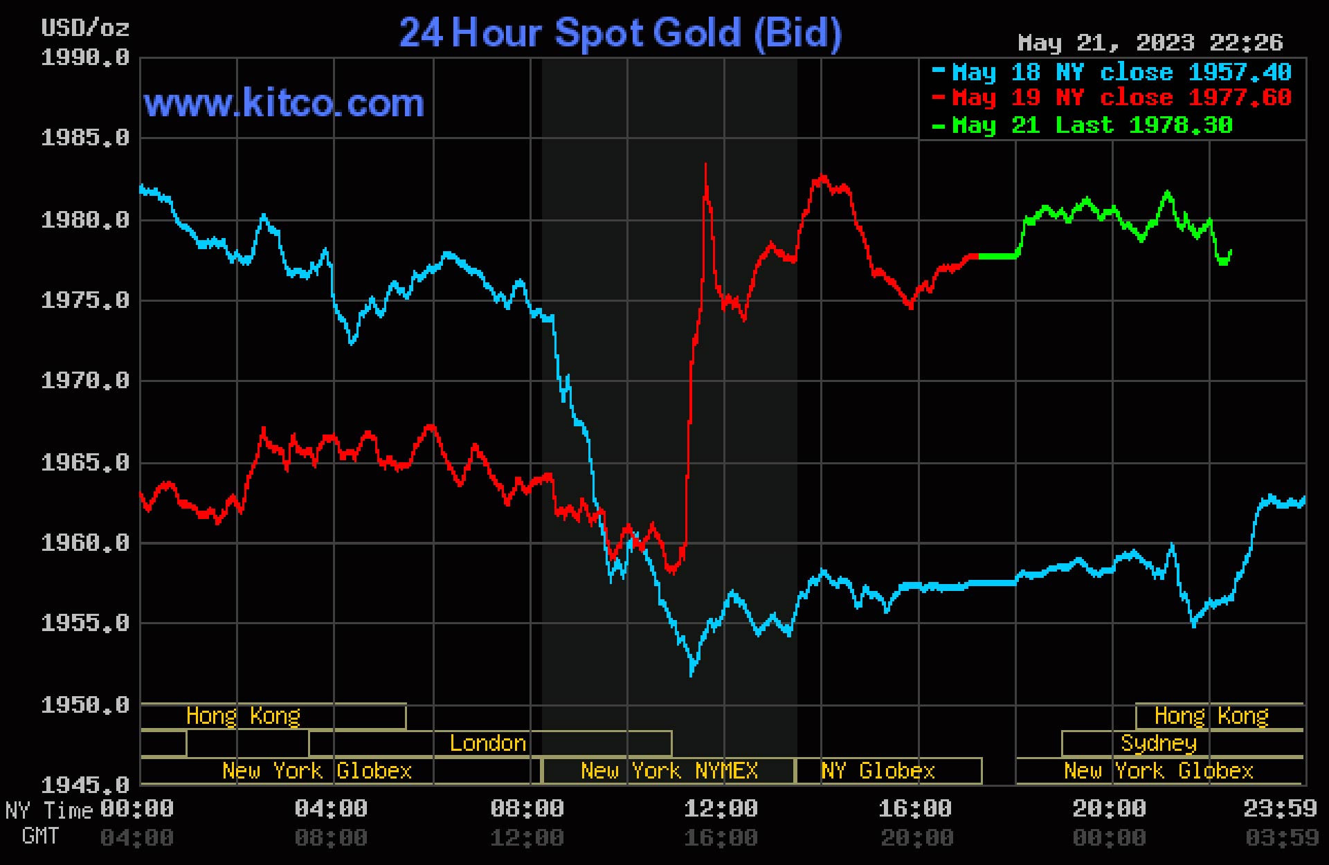 Lúc 10h06' hôm nay (ngày 22/5, giờ Việt Nam), giá vàng thế giới giao ngay đứng quanh ngưỡng 1.977,9 USD/ounce, tăng 0,9 USD/ounce so với cuối tuần qua. Giá vàng giao tương lai tháng 6 trên sàn Comex New York ở mức 1.997,9 USD/ounce, tăng 19,9 USD/ounce so với cuối tuần qua.