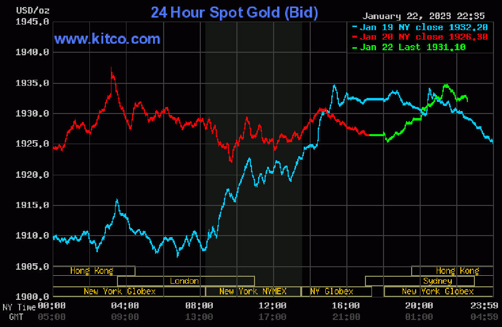 Tới 10h28' hôm nay (ngày 23/1, giờ Việt Nam), giá vàng thế giới giao ngay đứng quanh ngưỡng 1.932,7 USD/ounce, tăng 6,7 USD/ounce so với đêm qua. Giá vàng giao tương lai tháng 4 trên sàn Comex New York ở mức 1.950,5 USD/ounce, tăng 23,2 USD/ounce so với đêm qua.