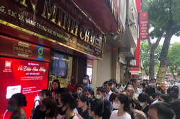 Khi giá vàng tăng mạnh vào ngày 22/4, một số cửa hàng vàng trên phố Trần Nhân Tông luôn trong tình trạng chật cứng khách xếp hàng. Nhiều người đến từ 6h30-7h sáng mong được vào sớm nhất.