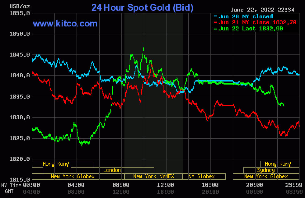 Đêm 22/6 (giờ Việt Nam), giá vàng thế giới giao ngay đứng quanh ngưỡng 1.843 USD/ounce. Vàng giao tháng 8 trên sàn Comex New York ở mức 1.845 USD/ounce.