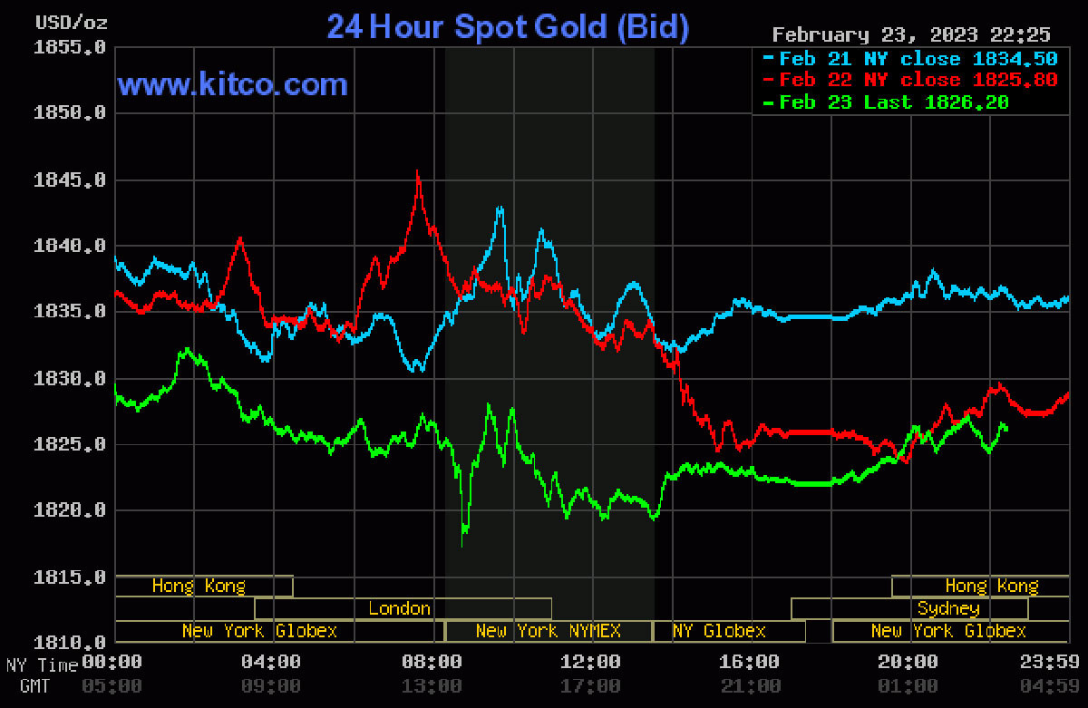 Tới 10h15' hôm nay (ngày 24/2, giờ Việt Nam), giá vàng thế giới giao ngay đứng quanh ngưỡng 1.826,7 USD/ounce, tăng 2,7 USD/ounce so với đêm qua. Giá vàng giao tương lai tháng 4 trên sàn Comex New York ở mức 1.832,9 USD/ounce, tăng 7,9 USD/ounce so với đêm qua.