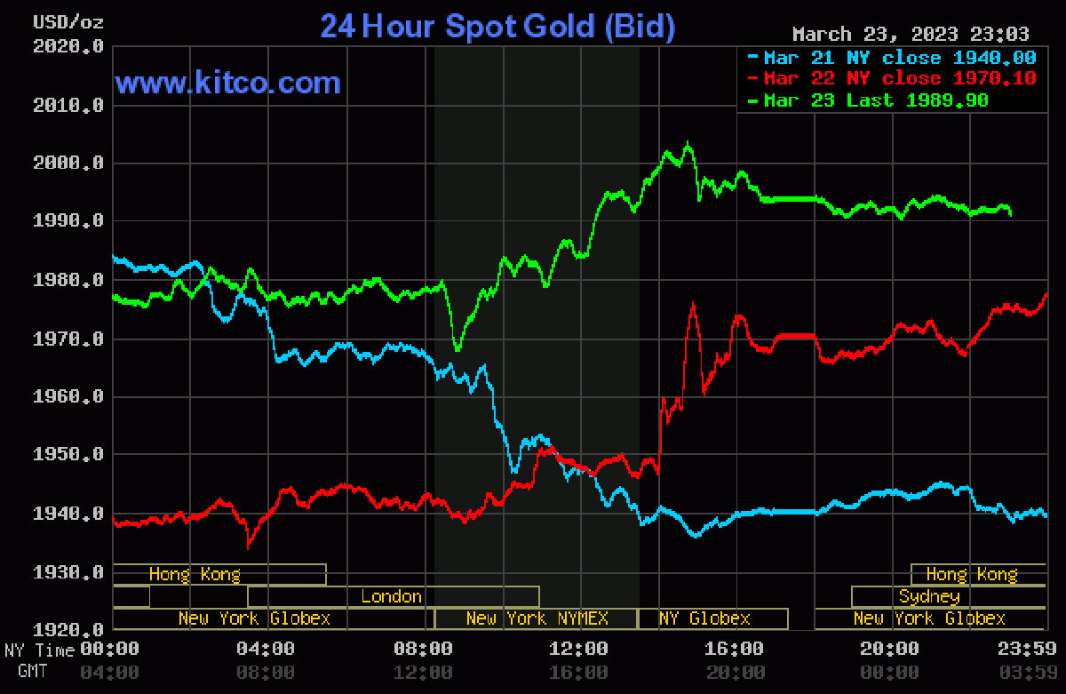 Tới 10h hôm nay (ngày 24/3, giờ Việt Nam), giá vàng thế giới giao ngay đứng quanh ngưỡng 1.992 USD/ounce, tăng 22 USD/ounce so với đêm qua. Giá vàng giao tương lai tháng 6 trên sàn Comex New York ở mức 2.012,8 USD/ounce, tăng 41,8 USD/ounce so với đêm qua.
