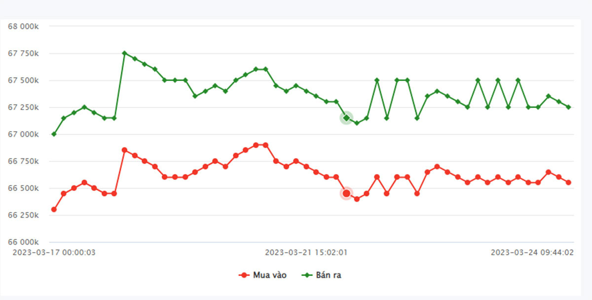 Chốt phiên giao dịch 23/3, giá vàng miếng 9999 tại SJC TP.HCM là 66,6 triệu đồng/lượng (mua vào) – 67,3 triệu đồng/lượng (bán ra). SJC Hà Nội niêm yết ở mức 66,6 triệu đồng/lượng (mua vào) và 67,32 triệu đồng/lượng (bán ra).