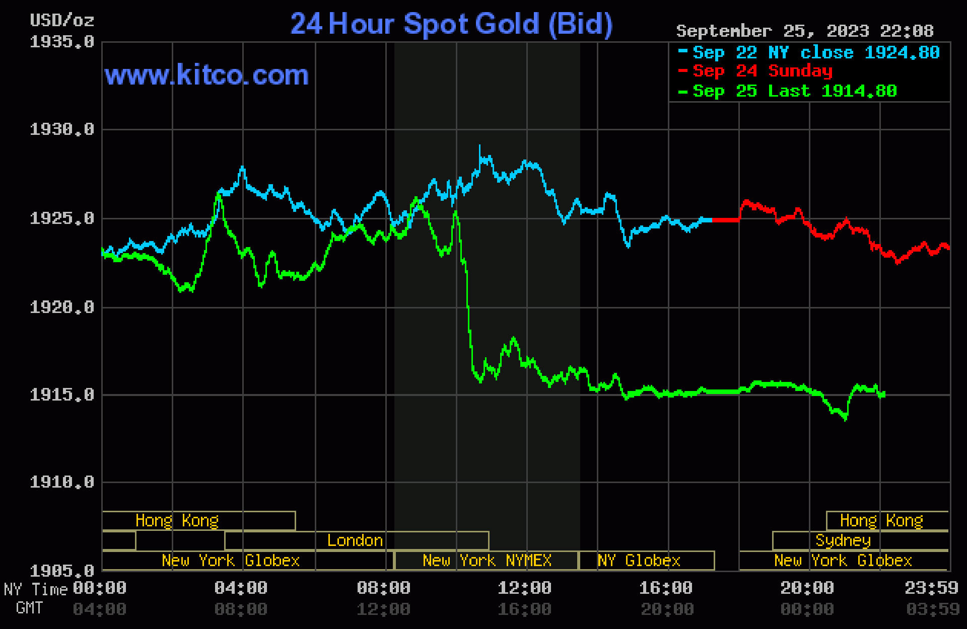 Giá vàng giảm do lãi suất trái phiếu kho bạc Mỹ tăng và đạt mức cao nhất trong nhiều năm. Chỉ số DXY lên mức cao nhất trong 6,5 tháng. Chỉ số DXY (đo lường biến động của đồng bạc xanh so với 6 đồng tiền chủ chốt trên thế giới) giao dịch ở mức 106,4 điểm.