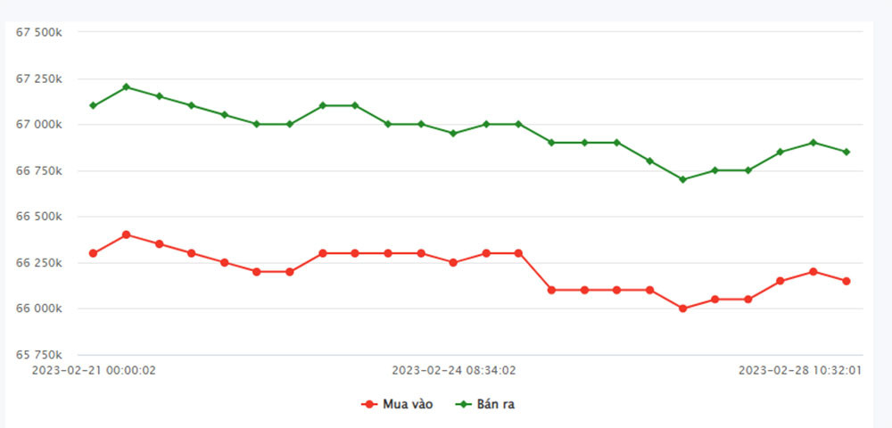 Chốt phiên giao dịch 27/2, giá vàng miếng 9999 tại SJC TP.HCM là 66,05 triệu đồng/lượng (mua vào) - 66,75 triệu đồng/lượng (bán ra). SJC Hà Nội niêm yết ở mức 66,05 triệu đồng/lượng (mua vào) và 66,77 triệu đồng/lượng (bán ra).