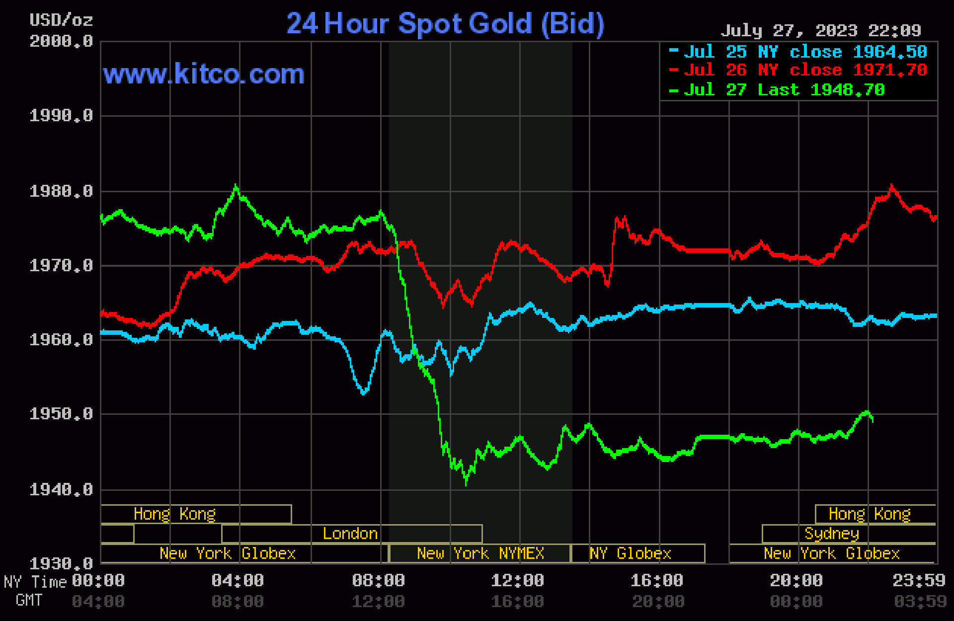 Trên thị trường thế giới, giá vàng giao ngay sàn Kitco 27/7 (lúc 20h, theo giờ Việt Nam) giao dịch ở mức 1.955 USD/ounce.