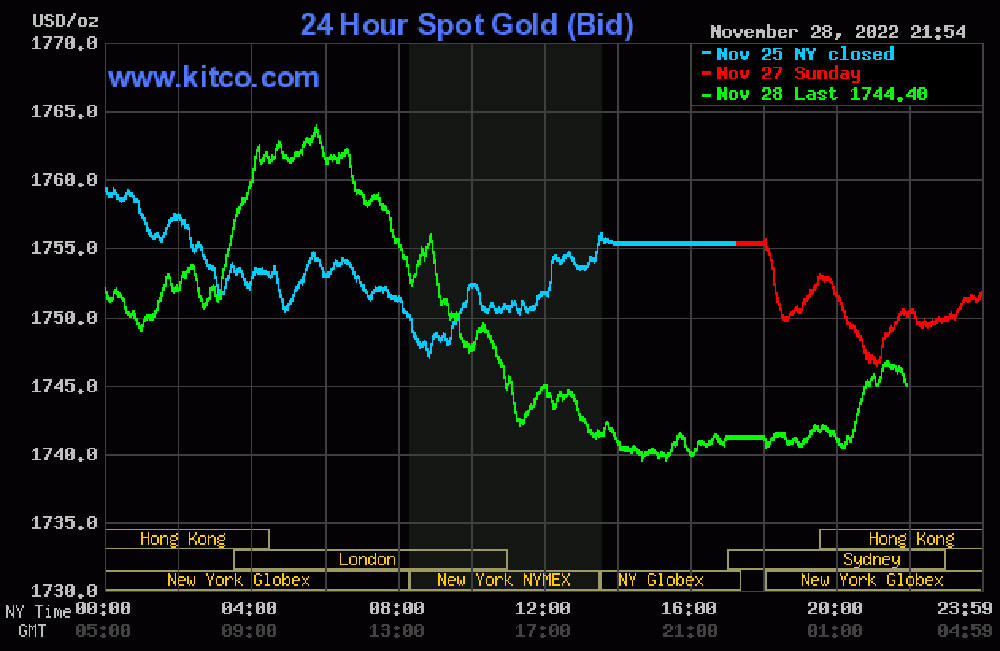 Tới 9h51' hôm nay (ngày 29/11, giờ Việt Nam), giá vàng thế giới giao ngay đứng quanh ngưỡng 1.745 USD/ounce, giảm 12,6 USD/ounce so với đêm qua. Giá vàng giao tương lai tháng 2/2023 trên sàn Comex New York ở mức 1.759,7 USD/ounce, tăng 0,6 USD/ounce so với đêm qua.