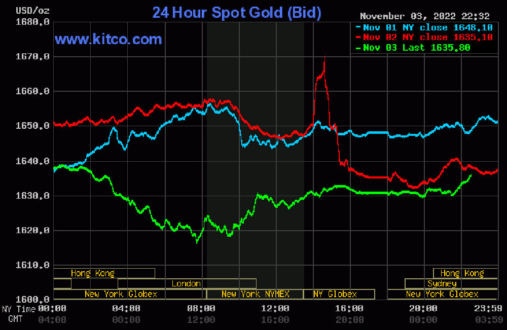 Tới 9h30' hôm nay (ngày 4/11, giờ Việt Nam), giá vàng thế giới giao ngay đứng quanh ngưỡng 1.635,5 USD/ounce, tăng 15,5 USD/ounce so với đêm qua. Giá vàng giao tương lai tháng 12 trên sàn Comex New York ở mức 1.636,4 USD/ounce.