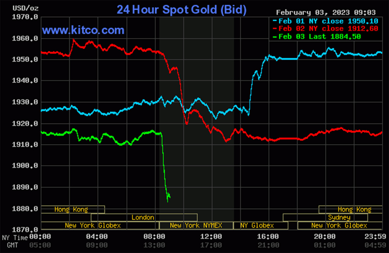 Tới 10h47' hôm nay (ngày 4/2, giờ Việt Nam), giá vàng thế giới giao ngay đứng quanh ngưỡng 1.864,3 USD/ounce, giảm 17,7 USD/ounce so với đêm qua. Giá vàng giao tương lai tháng 4 trên sàn Comex New York ở mức 1.876,6 USD/ounce, giảm 6,4 USD/ounce so với đêm qua.
