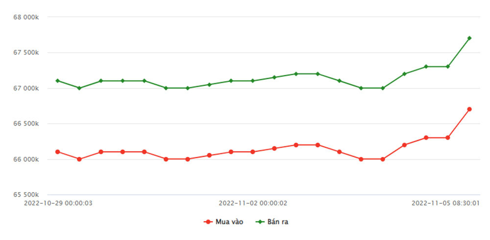 Kết thúc phiên 4/11, giá vàng miếng 9999 tại SJC TP.HCM là 66,3 triệu đồng/lượng (mua vào)- 67,3 triệu đồng/lượng (bán ra). SJC Hà Nội niêm yết ở mức 66,3 triệu đồng/lượng (mua vào) và 67,32 triệu đồng/lượng (bán ra).