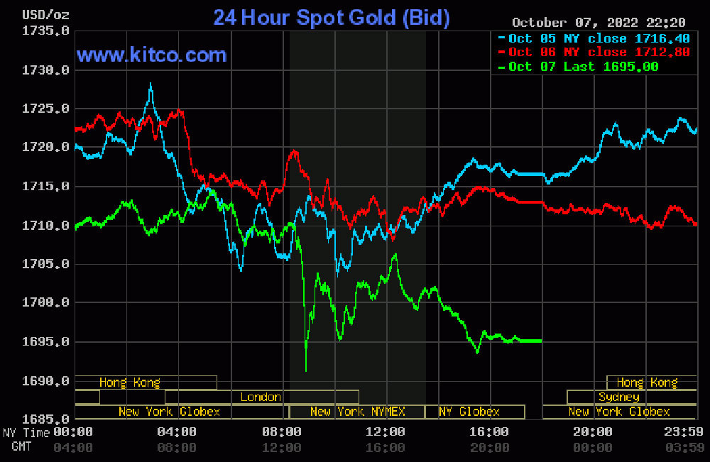 Tới 9h20' hôm nay (ngày 8/10, giờ Việt Nam), giá vàng thế giới giao ngay đứng quanh ngưỡng 1.695 USD/ounce, giảm 17,8 USD/ounce so với đêm qua. Giá vàng giao tương lai tháng 12 trên sàn Comex New York ở mức 1.709,3 USD/ounce, giảm 11,5 USD/ounce so với đêm qua.