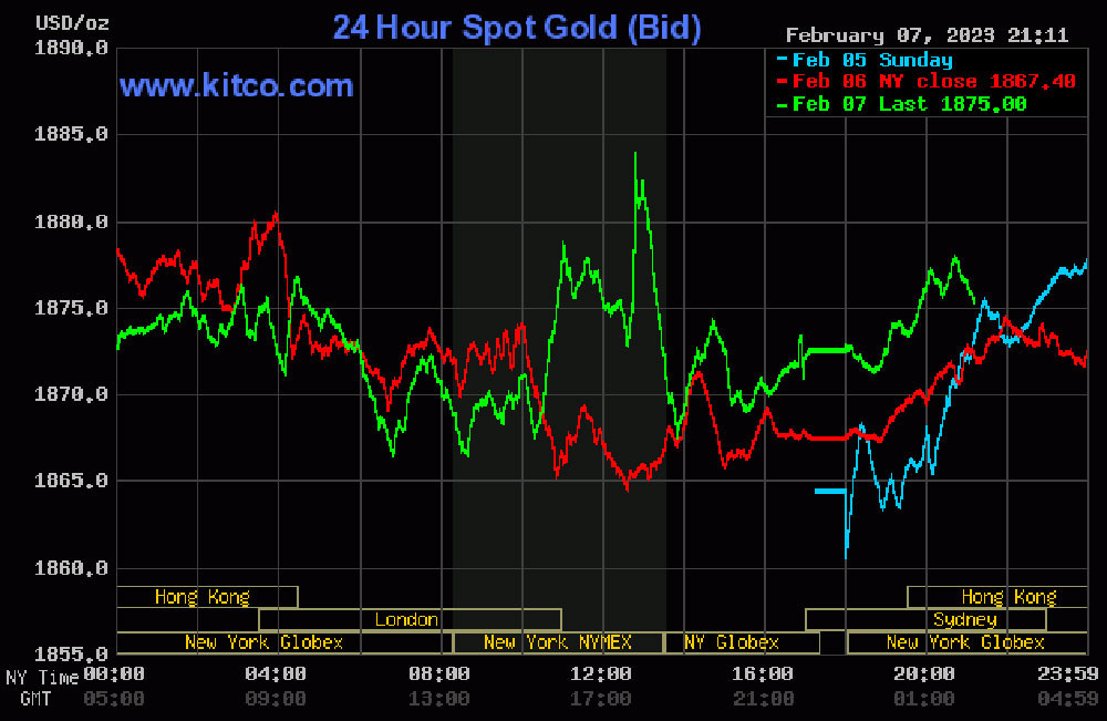 Đêm 7/2 (giờ Việt Nam), giá vàng thế giới giao ngay đứng quanh ngưỡng 1.870 USD/ounce. Vàng giao tháng 4 trên sàn Comex New York ở mức 1.982 USD/ounce.