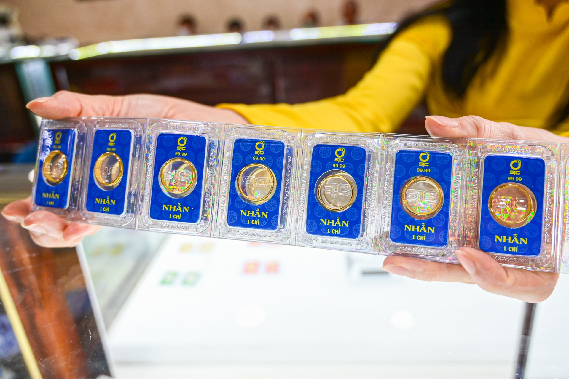 Giá mua vào vàng nhẫn và vàng miếng tại SJC hiện ngang nhau. Trong khi các doanh nghiệp khác đang niêm yết giá mua vào vàng nhẫn cao hơn giá mua vàng miếng SJC từ 600-900 nghìn đồng mỗi lượng.