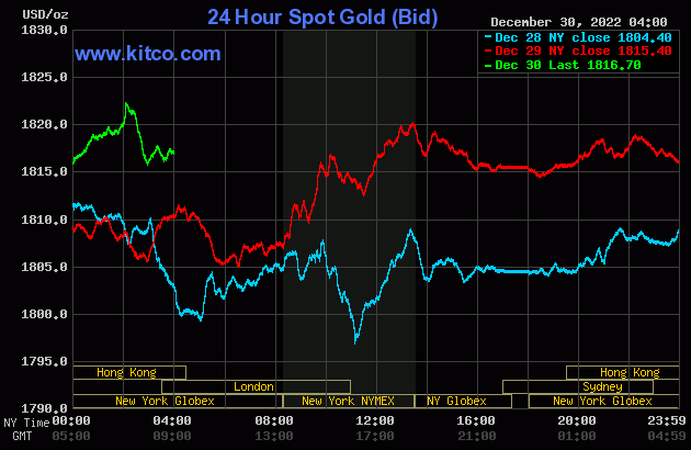 Chốt phiên 30/12, giá vàng giao ngay chốt phiên giao dịch ở mức 1.816 USD/ounce. Giá vàng giao kỳ hạn giao dịch ở mức 1.817 USD/ounce.