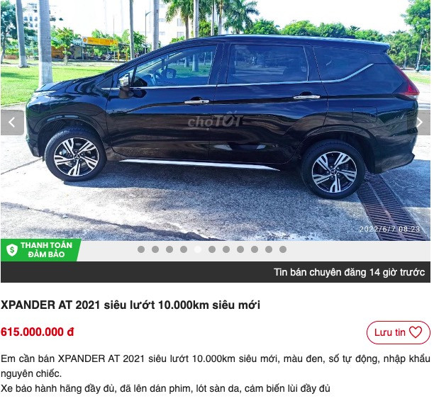 Trên một trang chuyên mua bán ô tô, một chiếc Mitsubishi Xpander AT đời 2021 biển tỉnh đang được chủ xe rao với giá 615 triệu đồng. Chủ chiếc xe này cho biết, xe đã chạy được 10.000 km và đã đầu tư thêm khá nhiều tiền cho chiếc xe để dán kính, trải sàn, lắp cảm biến lùi,...