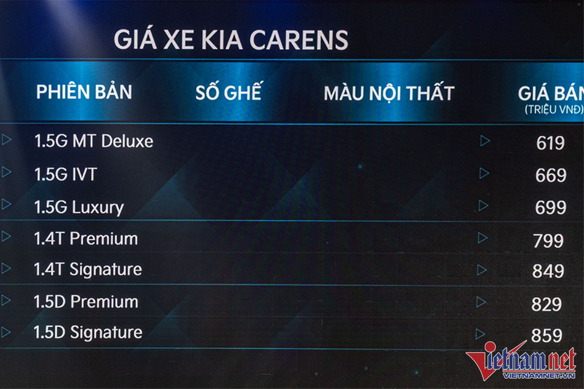Kia Carens 2023 có 7 phiên bản, dải đều ở 3 biến thể động cơ, riêng các phiên bản cao cấp nhất có thêm tùy chọn kiểu 6 chỗ bên cạnh kiểu 7 chỗ ngồi tiêu chuẩn.
