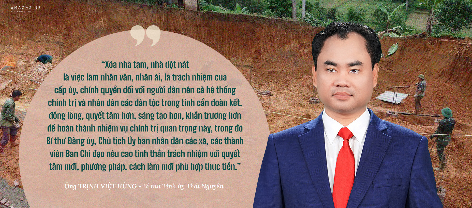 Xóa nhà tạm, nhà dột nát có thể xem là “bài test” cho Thái Nguyên sau sáp nhập tỉnh và vận hành chính quyền địa phương 2 cấp. Với sự vào cuộc của cả hệ thống chính trị, các tổ chức, đoàn thể; sự chung tay của các lực lượng vũ trang và cộng đồng doanh nghiệp, công tác xóa nhà tạm trên địa bàn tỉnh đã được đẩy lên thành một phong trào “toàn dân, toàn diện”.
