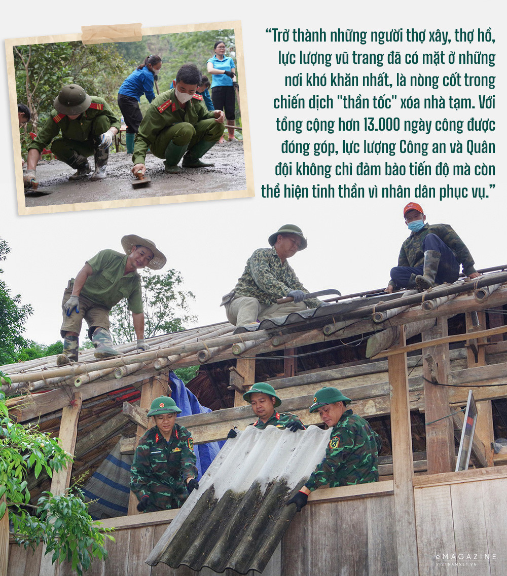 Khi bài toán kinh phí và sự đồng thuận được giải quyết, vai trò xung kích của lực lượng vũ trang đã được phát huy tối đa. Những người lính bộ đội, công an đã trở thành những người thợ xây, thợ hồ, “vượt nắng, thắng mưa” có mặt ở các địa bàn khó khăn nhất.