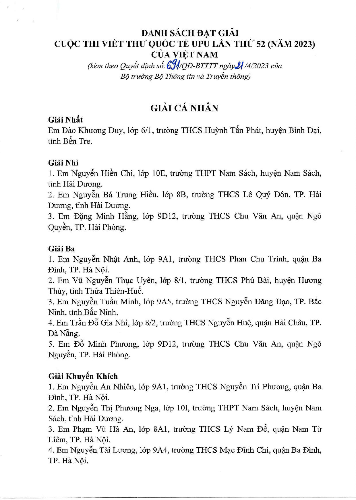 Ban Giám khảo cuộc thi Viết thư Quốc tế UPU 52 (năm 2023) đã chấm và bầu chọn em Đào Khương Duy - học sinh lớp 6/1 (Trường THCS Huỳnh Tấn Phát, huyện Bình Đại, tỉnh Bến Tre) là chủ nhân của bức thư đoạt giải Nhất.