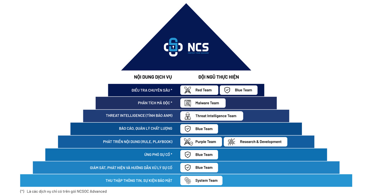 Là bộ giải pháp tổng thể gồm từ phần mềm nền tảng, hạ tầng công nghệ đến dịch vụ vận hành, NCSOC giám sát tất cả sự kiện diễn ra trên hệ thống, phân tích, đánh giá để qua đó phát hiện sớm và ngăn chặn nguy cơ tấn công mạng.