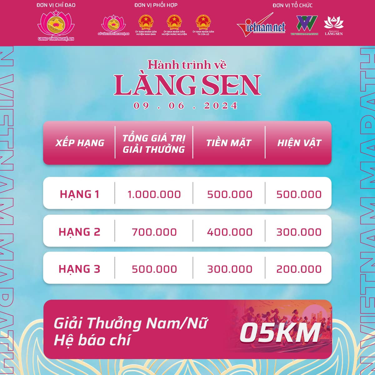 Cụ thể, VĐV về nhất hệ báo chí cự ly 5km được nhận tổng giá trị 1 triệu đồng với cả nam và nữ, về nhất cự ly 10km được nhận 1,7 triệu đồng, nhất cự ly 21km được nhận 1,9 triệu đồng và nhất cự ly 42km được nhận 2,7 triệu đồng.