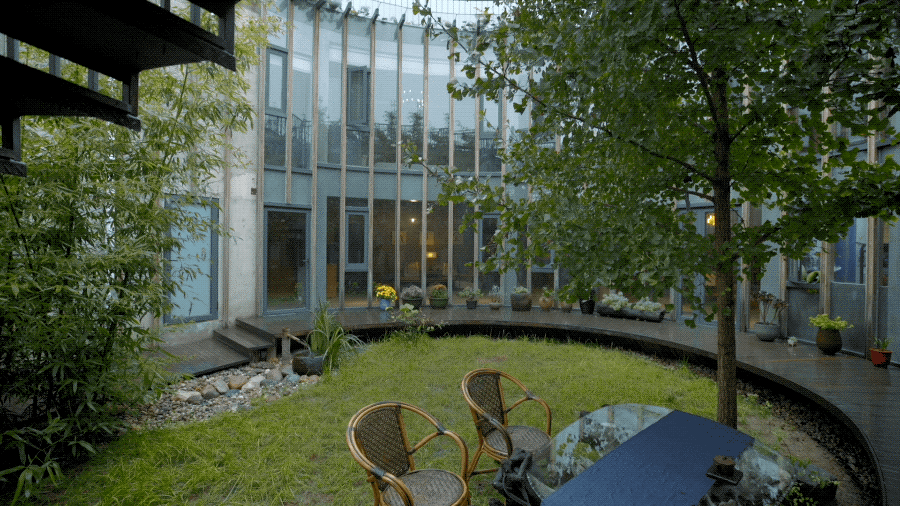 Sân trong nằm ở giữa nhà có hình tròn với các tường kính xung quanh. Các tường kính này đưa ánh sáng vào nhà, các căn phòng đều được đón ánh nắng mặt trời mỗi ngày. |