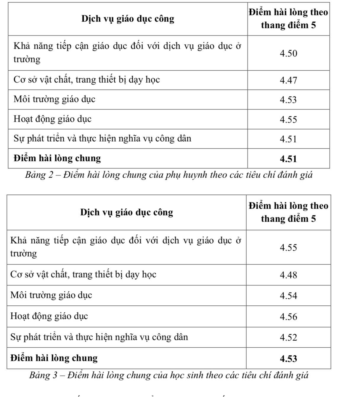 Cụ thể điểm hài lòng chung của phụ huynh năm 2023 đạt 4,51 điểm (năm 2022 đạt 4,48 điểm) và điểm hài lòng chung của học sinh đạt 4,53 điểm (năm 2022 đạt 4,37 điểm). Điều này thể hiện phần nào sự hài lòng của người dân, đối với ngành giáo dục.