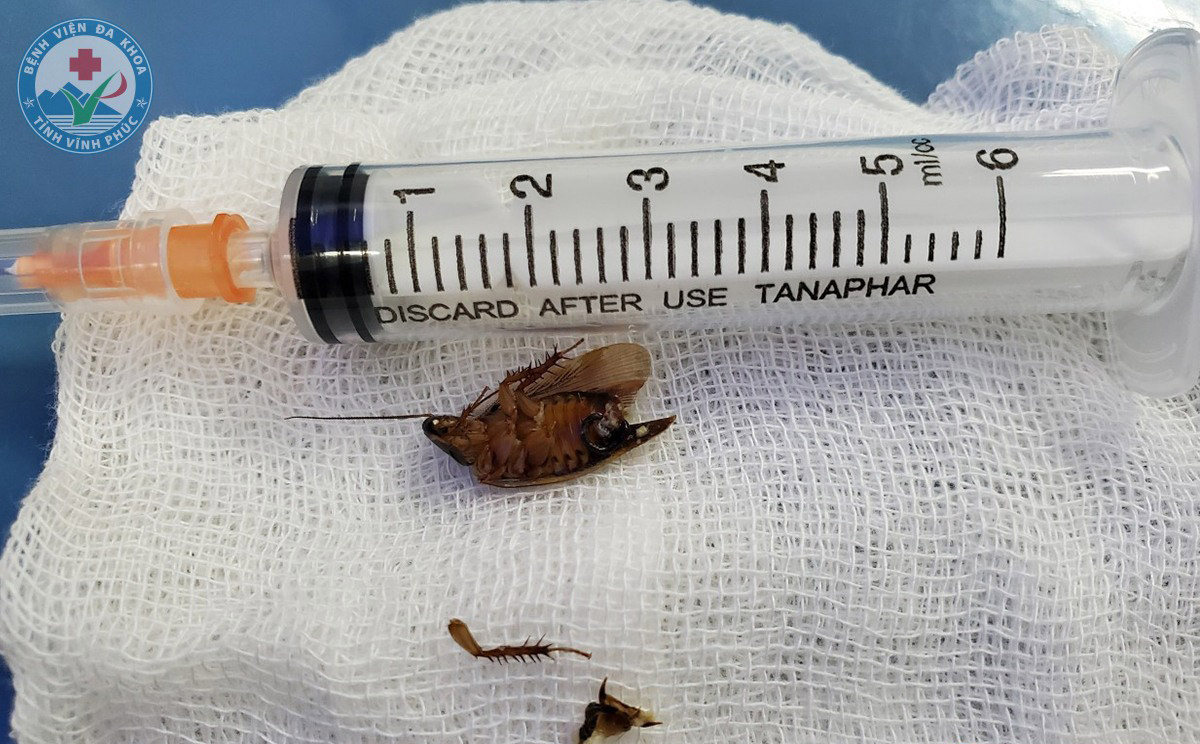 Qua thăm khám, nội soi tai mũi họng, bác sĩ phát hiện trong ống tai ngoài bên phải của người bệnh có dị vật là một con gián vẫn còn sống. Bác sĩ lập tức xử lý gắp dị vật trong tai người bệnh bằng cách làm chết con gián bằng nước oxy già để giảm tác động gây đau cho người bệnh, sau đó tiến hành gắp loại bỏ dị vật và vệ sinh lại ống tai, tránh nhiễm trùng cho người bệnh.