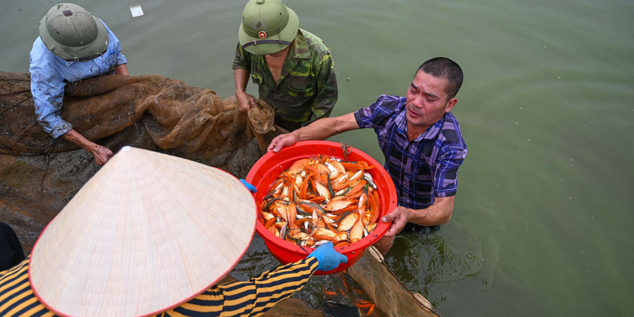 Trước lễ tiễn Táo quân chầu trời từ 3 đến 4 ngày, người dân làng Thuỷ Trầm (Tuy Lộc, Cẩm Khê, Phú Thọ) bắt đầu xắn quần xuống ao quăng lưới, tát vét thu hoạch cá chép đỏ.