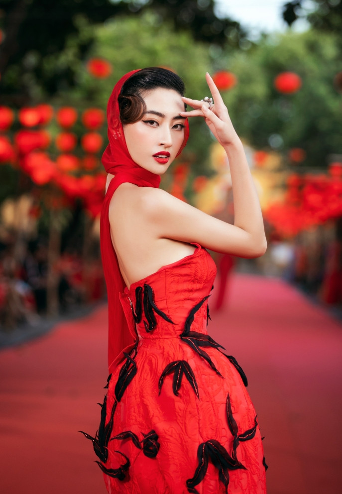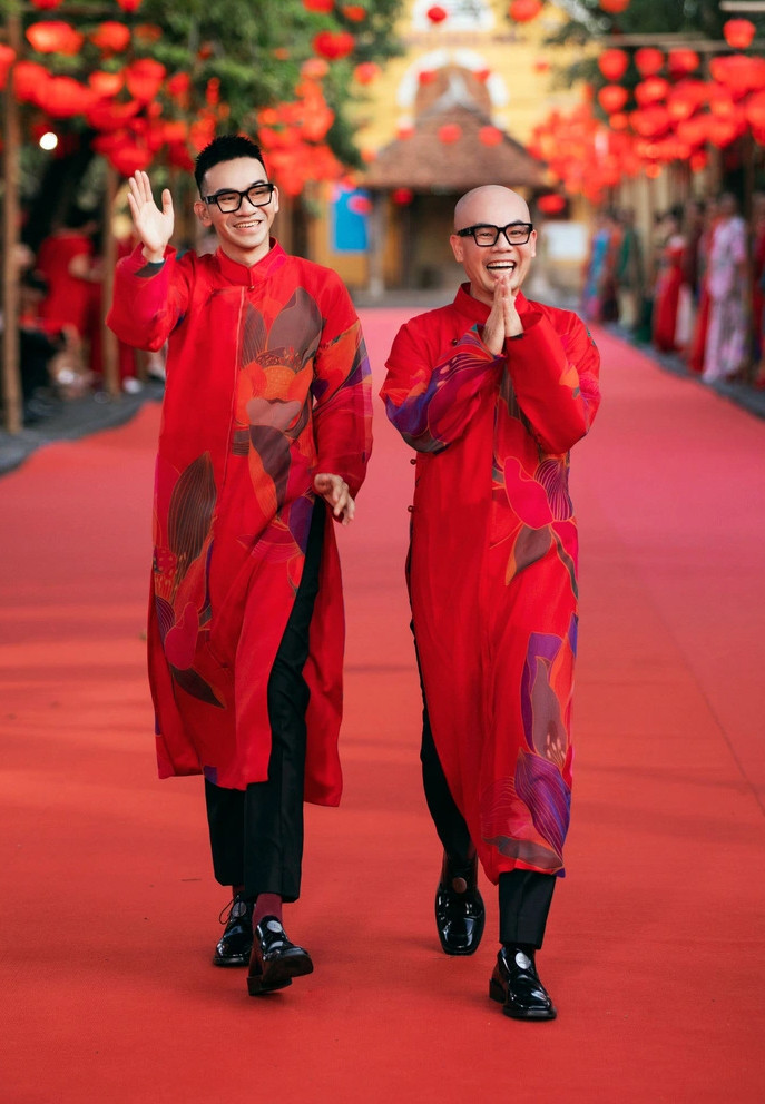 Hoa hậu Lương Thùy Linh và Tiểu Vy cùng giữ vị trí vedette khép lại show diễn. Họ được chở trên xích lô, diện thiết kế đồng điệu với họa tiết lá tre trên nền vải đỏ rực. Chiếc khăn choàng đầu dài 2m làm nổi bật yếu tố thời trang, vừa tôn rõ nét Á Đông để khép lại show.
