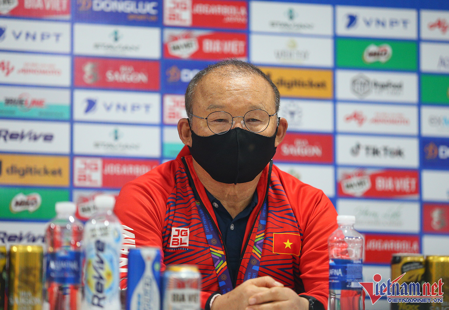 Xuất hiện trong phòng họp báo sau trận đấu, HLV Park Hang Seo nhận những tràng pháo tay chúc mừng của giới truyền thông. Chiến lược gia người Hàn Quốc rất xúc động, ông ngồi một hồi lâu trước khi có những chia sẻ về tấm HCV SEA Games vừa giành được.