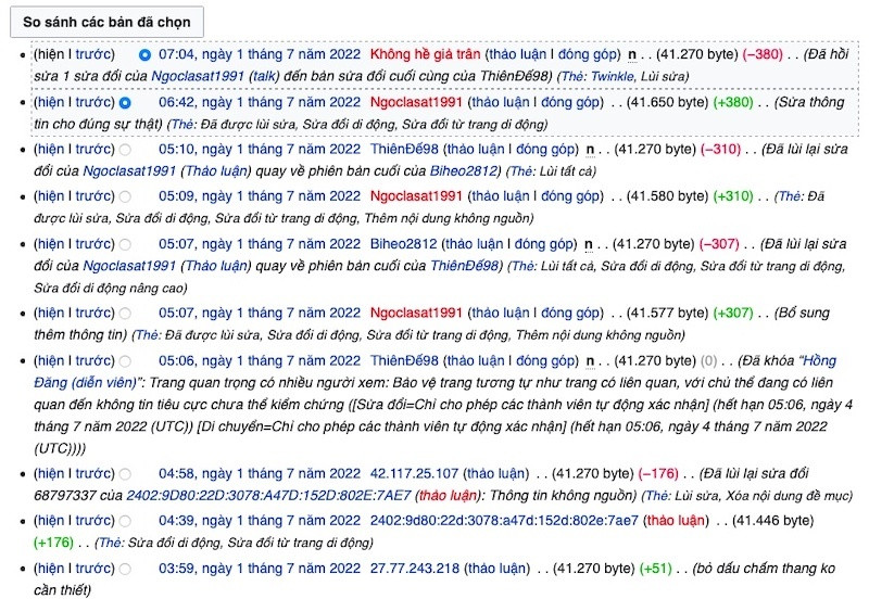 Cụ thể, chỉ trong ngày hôm nay 1/7, có đến 9 đoạn chỉnh sửa và phục hồi thông tin của diễn viên Hồng Đăng diễn ra trên trang wikipedia.org.