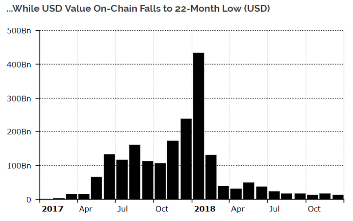 Cùng với đó, giá trị giao dịch bằng đồng USD đang giảm so với năm 2017, từ mức 1,1 tỷ USD xuống mức 815 triệu USD, còn về mặt giá trị, tổng giá trị giao dịch Ethereum đã giảm 97%, nguyên nhân chính là việc Ethereum đã giảm tới 95%.
